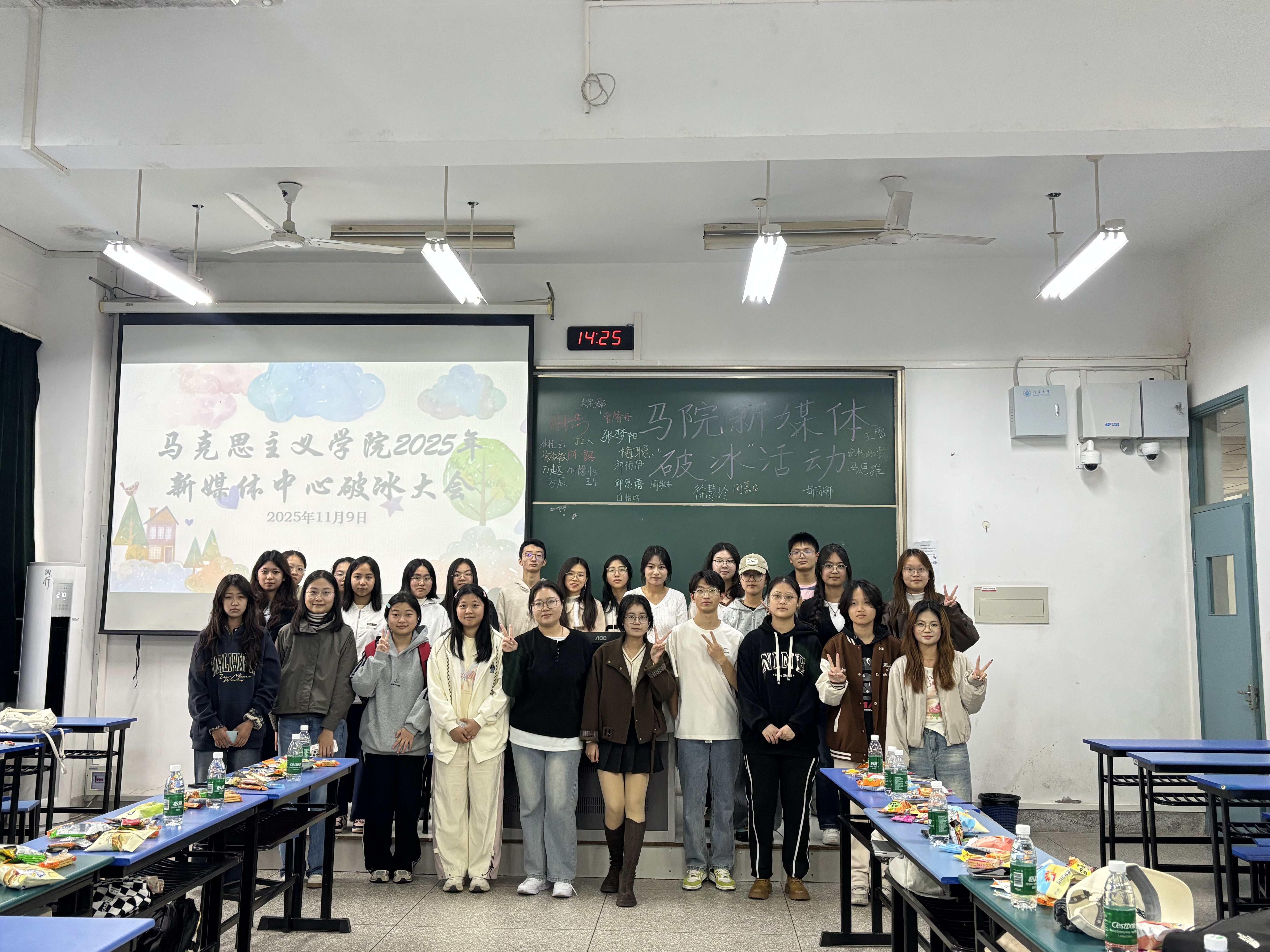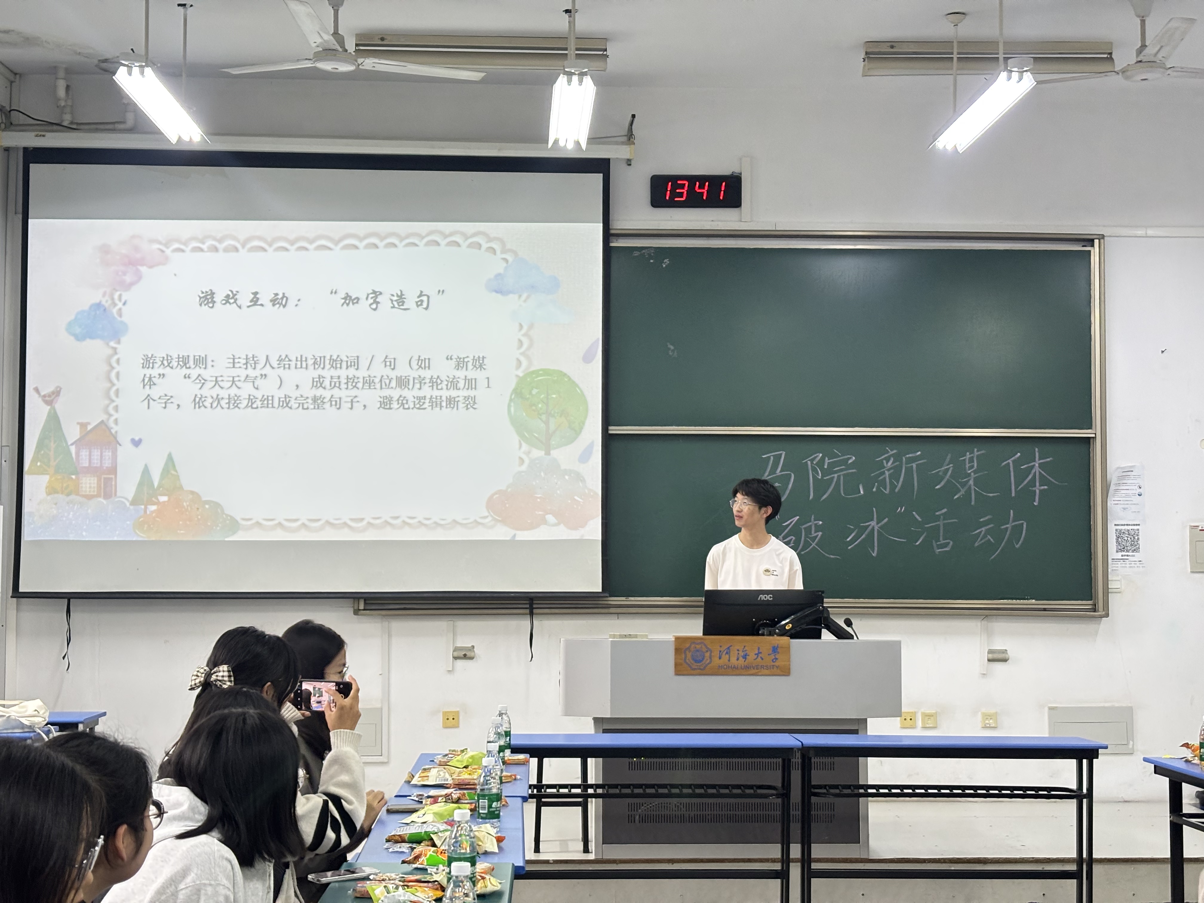 携手破冰聚合力,同心启航新篇章。为促进河海大学马克思主义学院本科生新媒体中心新老成员交流互鉴,为新学期各部门工作的开展奠定坚实基础,2025年11月9日14点,马克思主义学院本科生新媒体中心破冰大会在河海大学江宁校区励学楼A102顺利开展。本次活动由采编部部长梅聪主持。活动由自我介绍、游戏互动、合影留念三个环节组成,现场氛围轻松愉悦,笑语不断。