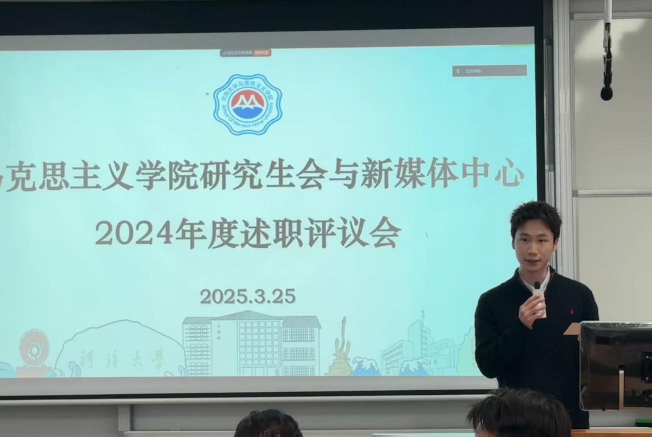 2025年3月25日上午10点,为深入推进研究生会工作的制度化、规范化、科学化,全面考察研究生会工作人员的综合素质,马克思主义学院研究生会与新媒体中心2024年度述职评议会在金坛校区A211顺利举行。本次会议由研究生会主席团成员林毅涵主持,学院院长戴锐教授、团委书记张洁老师、新媒体中心主任曹岩老师和团委副书记李祥老师出席此次会议,学院研究生会全体成员及研究生代表参加。