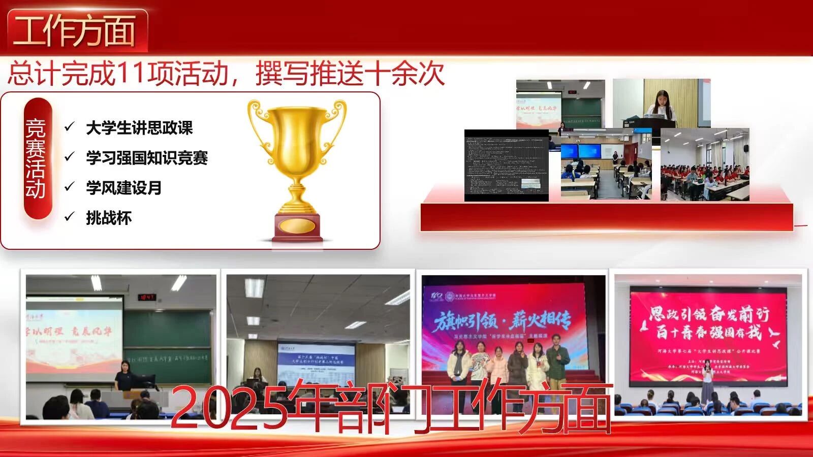 整体把握,重视日常工作。2025年学习与生活服务部始终坚持“团结一致、精做精干、认真负责”的工作原则,共参与举办总计11项活动,同时,部门还积极参与撰稿工作,向“河海大学马克思主义学院”微信公众号平台提供活动相关推送10余次。