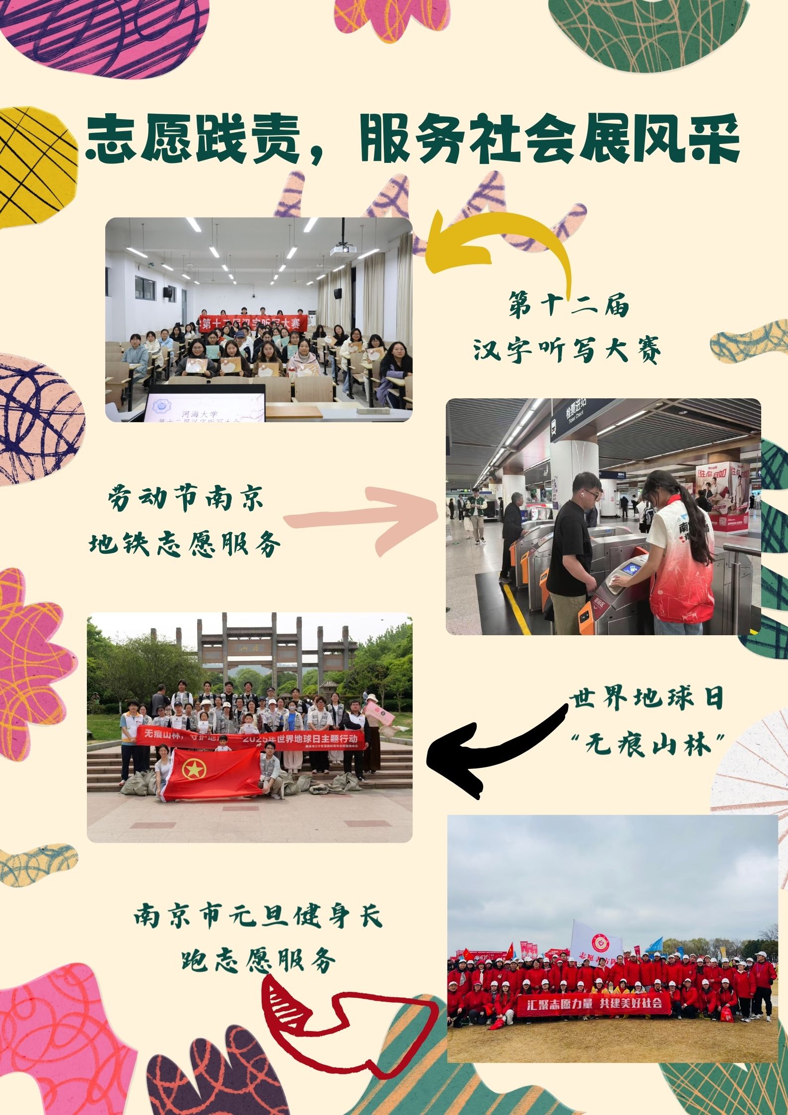 志愿践责,服务社会展风采。部门联合多方力量,开展覆盖公益帮扶、生态保护、公共服务三大领域的志愿服务。组织春季集体无偿献血、元旦健身长跑志愿等公益活动;开展世界地球日“山林无痕”、无废街区宣传等生态项目;参与南京地铁、矿博会等公共服务工作。努力让青春力量融入社会发展。