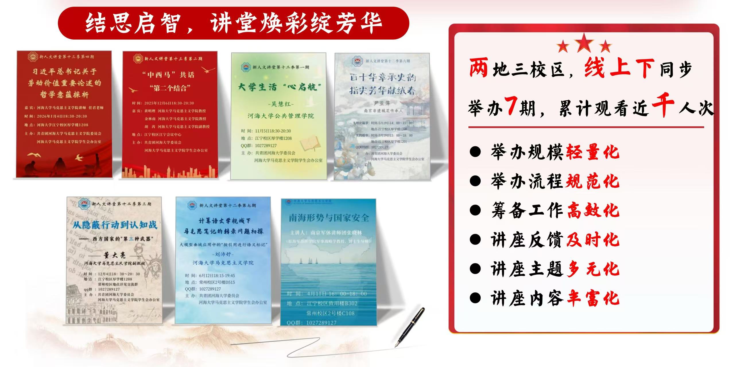 联动生辉,主承办会绽华章。2025年办公室共举办新人文讲堂系列讲座7期,其中第十三季第二期“中西马共话‘第二个结合’”主题讲座,创新师生围坐、平等交流的形式,广受师生好评。此外,办公室联合本科新生助学导师开展2025年“1+1+1”本硕博朋辈帮扶坊新生见面会;与学生部共同举办团学管培。