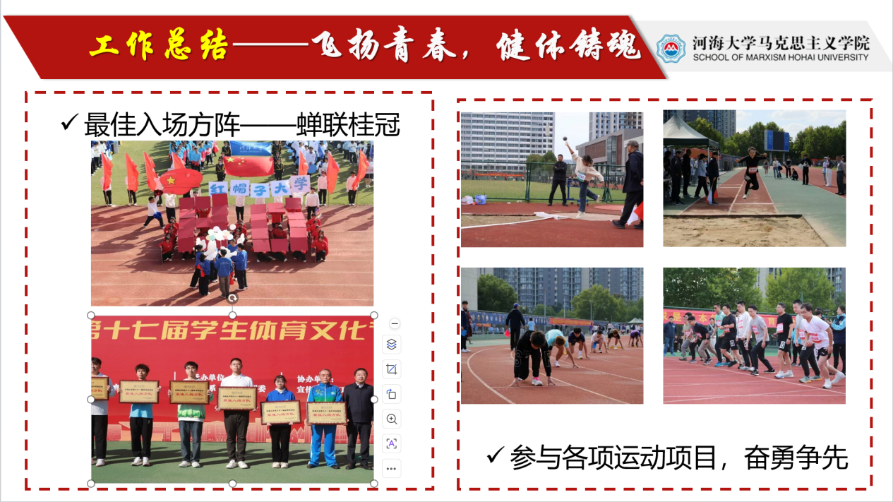 助推赛事,共燃青春活力。体育部动员并组织同学们广泛参与第六十一届校运会、新生杯篮球赛、奔跑吧、河海秋季校园 MINI 马拉松比赛、奔腾吧,河海师生羽毛球比赛等多样体育赛事,并提供全方位的后勤保障。在各部门的通力协作、各同学的共同努力下,学院连续四年荣获校运会最佳入场方阵称号。