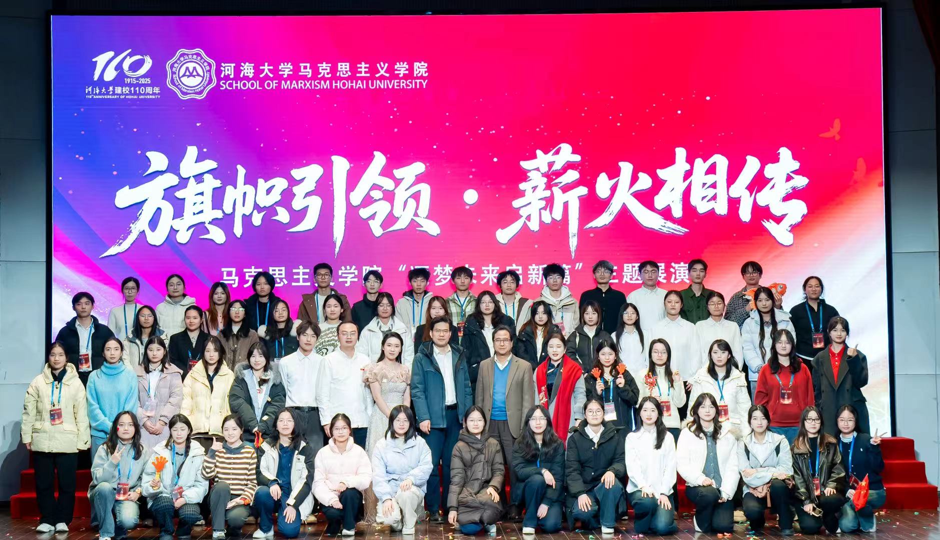 深耕学院特色,主动作为。为深化思想引领、彰显马院育人特色,部门成功举办以“旗帜引领,薪火相传”追梦未来启新篇主题展演。活动历经3个月精心筹备、经过多轮严格审核,凝聚马院师生双向奔赴之力,联动10个部门团结协作,组织志愿者69名,切实以文艺形式推动红色文化入脑入心。