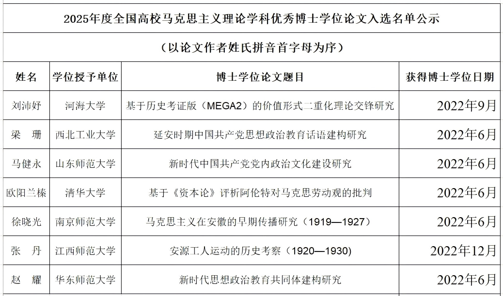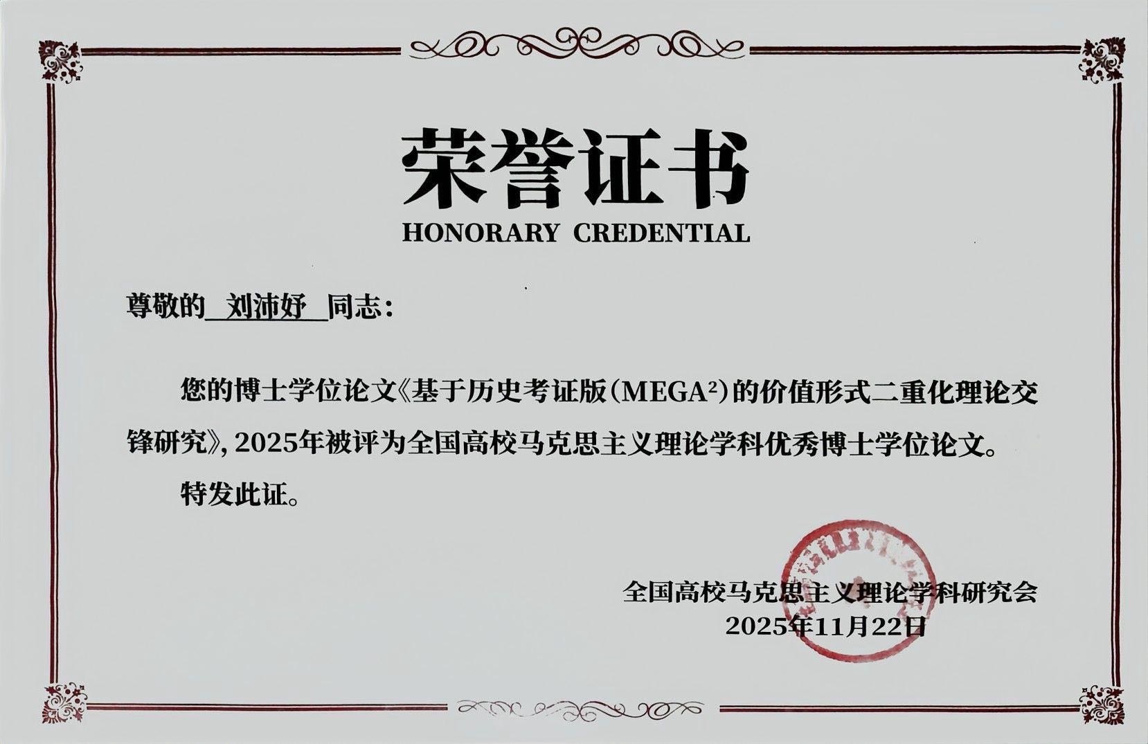 在11月22日举行的第十八届全国高校马克思主义理论学科博导论坛上,我院刘沛妤老师的博士学位论文《基于历史考证版(MEGA2)的 价值形式二重化理论交锋研究》入选2025年度全国高校马克思主义理论学科优秀博士学位论文。此次评选活动由国务院学位委员会马克思主义理论学科评议组、教育部社会科学委员会马克思主义理论学部、教育部高校思想政治理论课教学指导委员会指导,全国高校马克思主义理论学科研究会组织开展。经各马克思主义理论一级学科博士点及二级学科博士点单位推荐、专家盲审和会议推选,全国共计7篇博士学位论文入选2025年度全国高校马克思主义理论学科优秀博士学位论文,该奖项自2019年设立以来累计46篇博士论文入选。